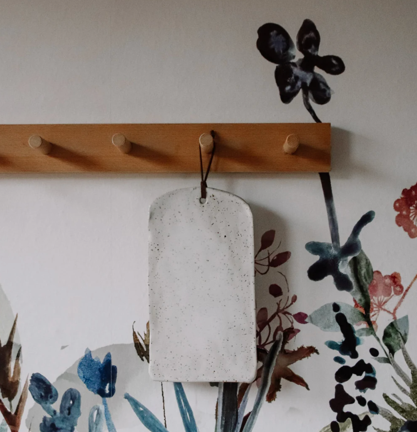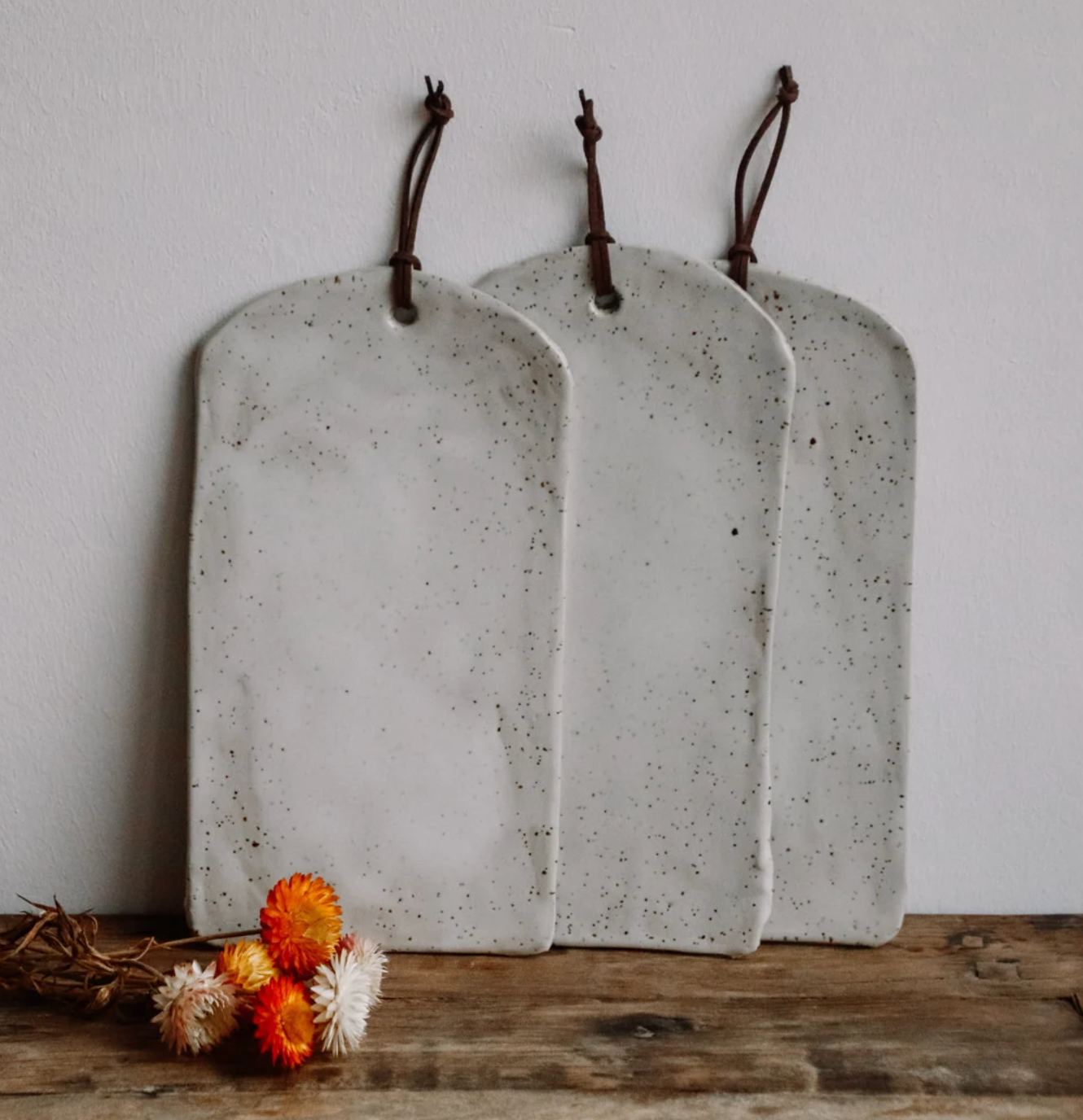 These stoneware ceramic cutting boards are handcrafted from speckled clay, with a glossy white glaze on the cutting surface. Available in 27 different colors (see color chart), they measure approximately 23 cm in length and 13 cm in width. A small leather strap is attached for convenient hanging.